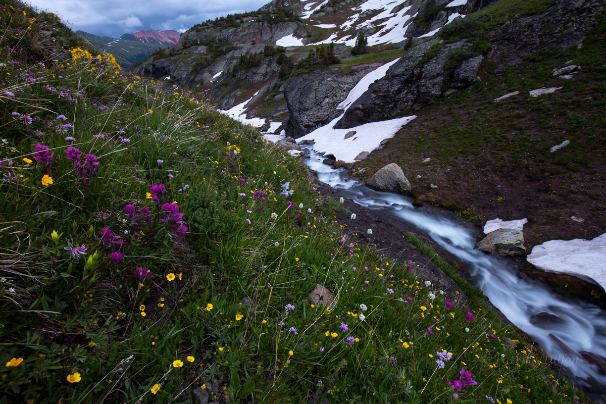 Since I found most of the paintbrush buds just developing at the lower elevations, I felt reluctant to search above timberline especially since there was still so much snow. Regardless I couldn’t resist checking out one of my favorite locations just north of Silverton, CO. Surprisingly, despite the heavy snow still clinging to the ground, I ran into a beautiful carpet of many different species in full bloom. All the flowers were on the south side of the slopes with little if any on the north face as my picture illustrates.